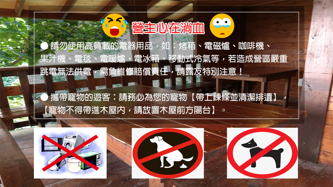 ※ 全區的露營屋、豪華野營帳、租借的吊掛式帳篷,以上皆禁止攜帶寵物入場,只有棧板C區自搭帳篷的客人才能帶寵物入場,如經發現,營主有權拒絕客人入場及再次訂位,訂位時請多留意。如經發現,營主有權拒絕客人入場及再次訂位,訂位時請多留意。