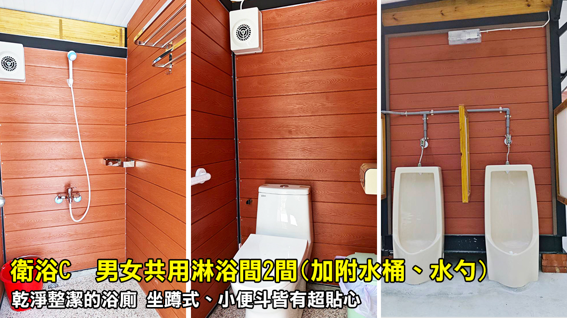 ※ 衛浴C:男女共用-淋浴間2間(加附水桶、水勺),廁所2間(坐2),小便斗2座,附兩座洗手台。