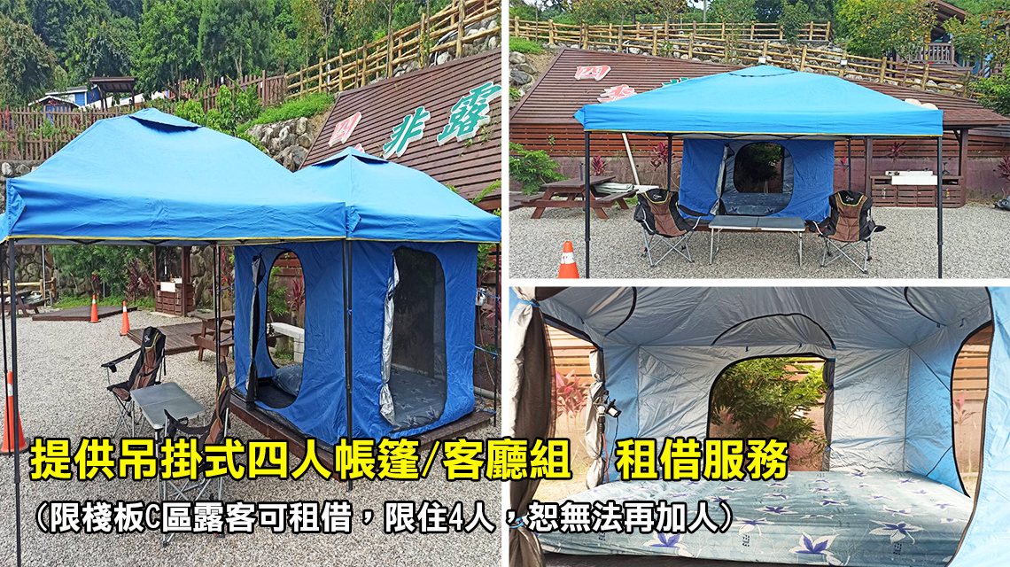 ※ 每帳營位基本入住4人,加人清潔費110cm以上150元,110cm以下100元,最多加2人 (無附任何物品、需自備),請直接線上下訂;如向營區租借因帳篷大小尺寸關係限住4人,恕無法再加人。