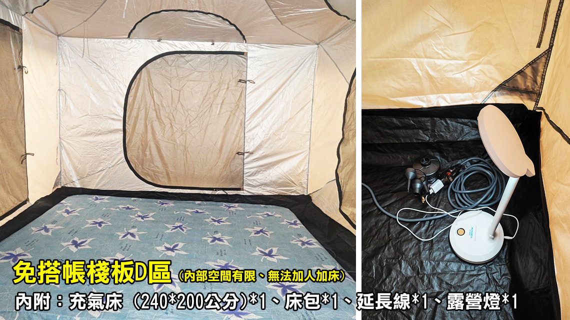 ※ 附吊掛式帳篷*1(尺寸:吊掛帳長290x寬290x高180CM,最頂部250CM)及客廳組(內附:充氣床 (240*200公分)*1、床包*1、延長線*1、客廳帳燈條*1、睡帳內小燈*1、摺疊桌*1、大川椅*2)、【含收搭】。
