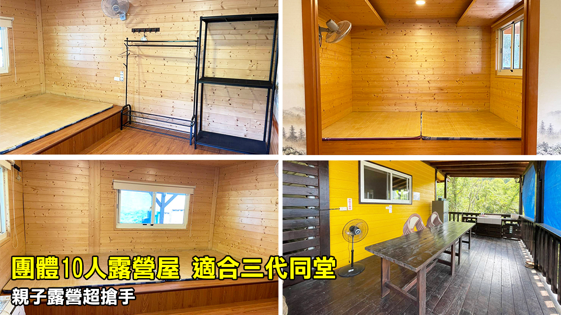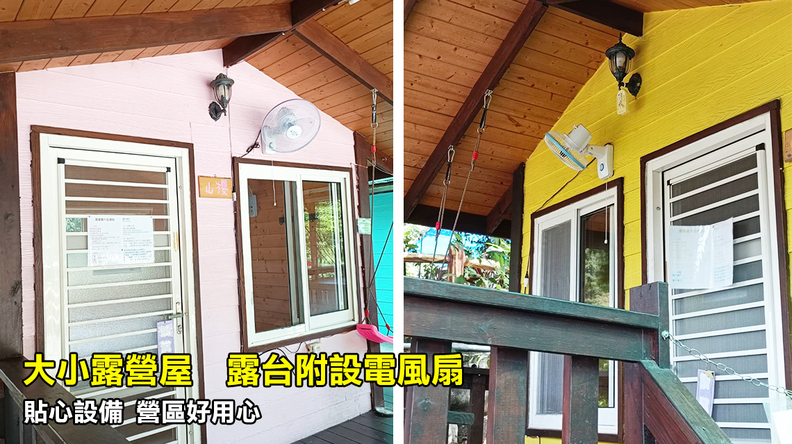 ※ 屋外均有陽台供客人炊事用,附照明、桌椅、電風扇及休閒鞦韆;大露台露營屋「共用陽台寬闊」,小露台露營屋享「獨立陽台舒適空間」。