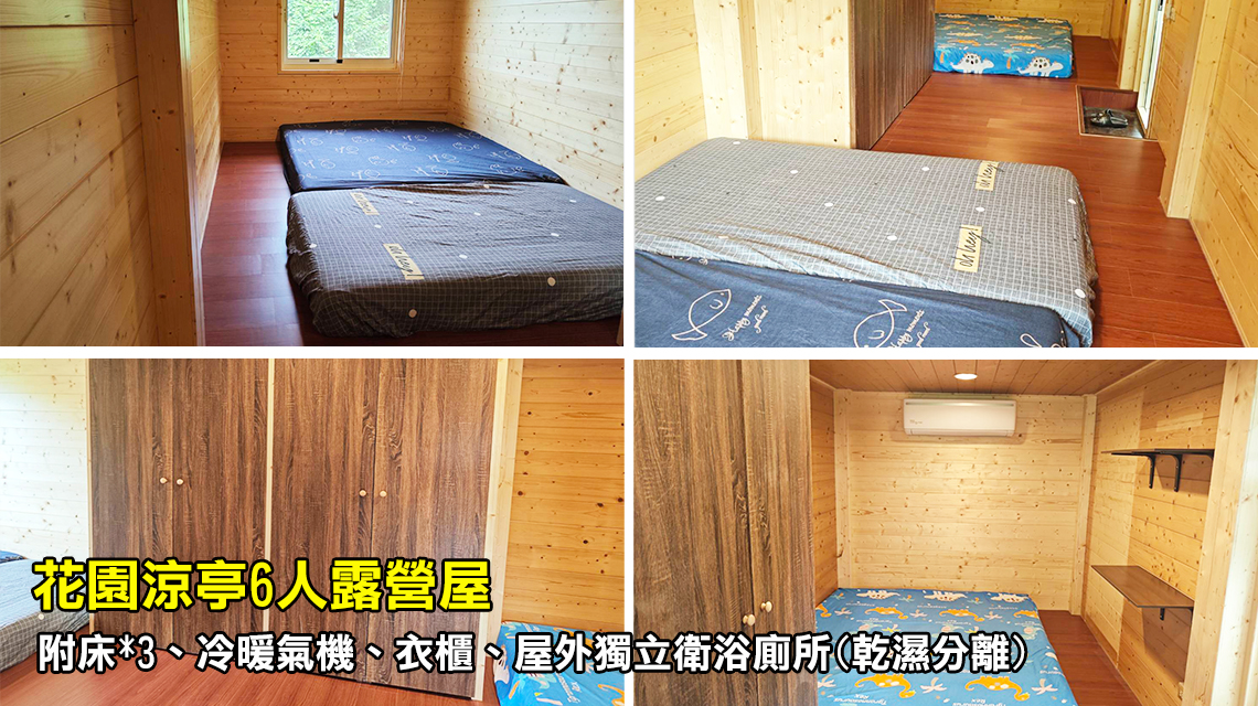 ※ 房內附6*6.2加大雙人床*2、3*6.2加大單人床*1 (最多睡6人無法再加人加床),冷暖氣機、衣櫃、置物架、遮陽窗簾。