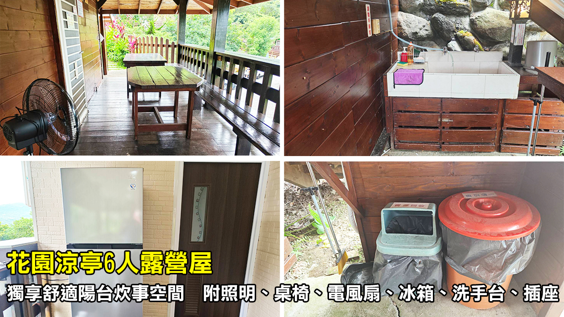 ※ 屋外有陽台供客人炊事用,附照明、6人桌椅,18吋立式電風扇、冰箱、洗手台、洗碗精、分類垃圾桶及廚餘桶,獨立衛浴廁所(乾濕分離),附洗髮精、潤髮乳、沐浴乳、牙膏牙刷、洗手乳,瓦斯熱水器、24小時熱水供應。