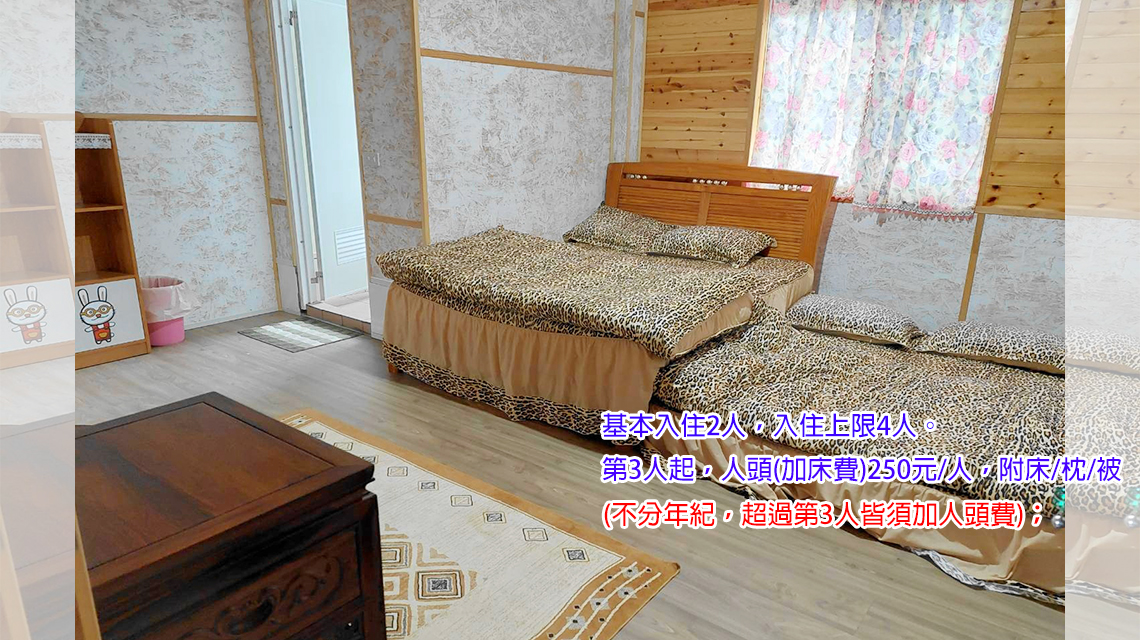 ※ 雙人輕露營:基本入住2人。第3人起,酌收人頭(加床費)250元/人,附床、枕頭、被子(不分年紀,超過第3人皆須加人頭費);入住上限4人。