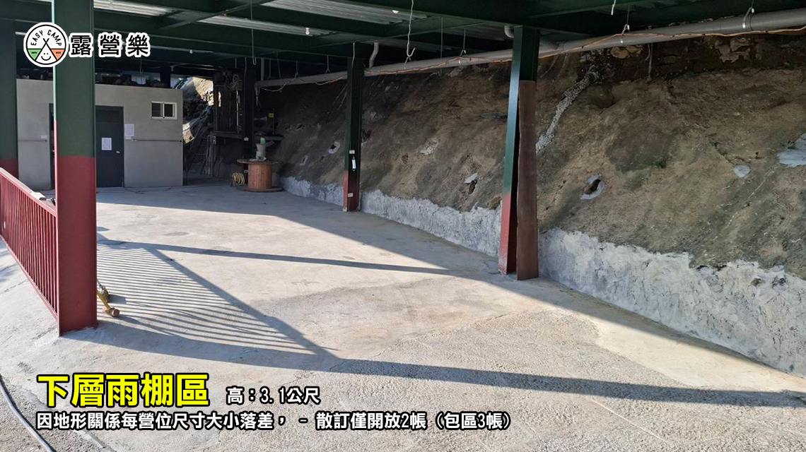 (請注意:因地形關係每營位尺寸大小落差,下層雨棚區 - 散訂僅開放2帳 (包區3帳)。