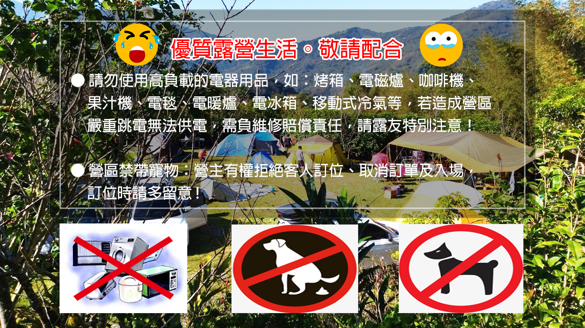 ※ 營區禁帶寵物,營主有權拒絕客人訂位、取消訂單及入場,訂位時請多留意。