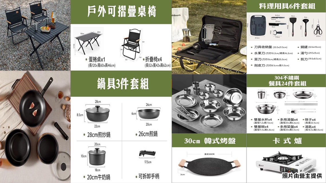 ◎炊煮用具:鍋具3件組、30cm韓式烤盤、卡式爐、不繡鋼餐具組、料理用具套組。詳見下方企劃圖