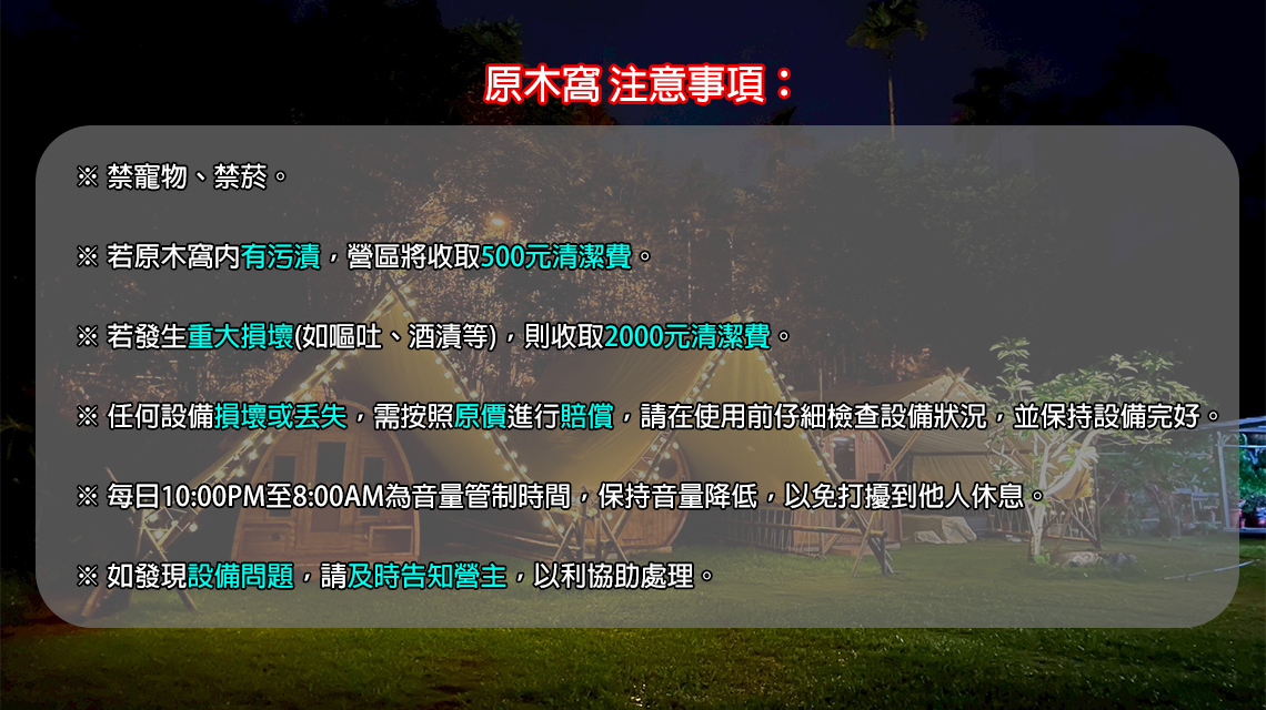 ◎若原木窩內有污漬,營區將收取500元清潔費。