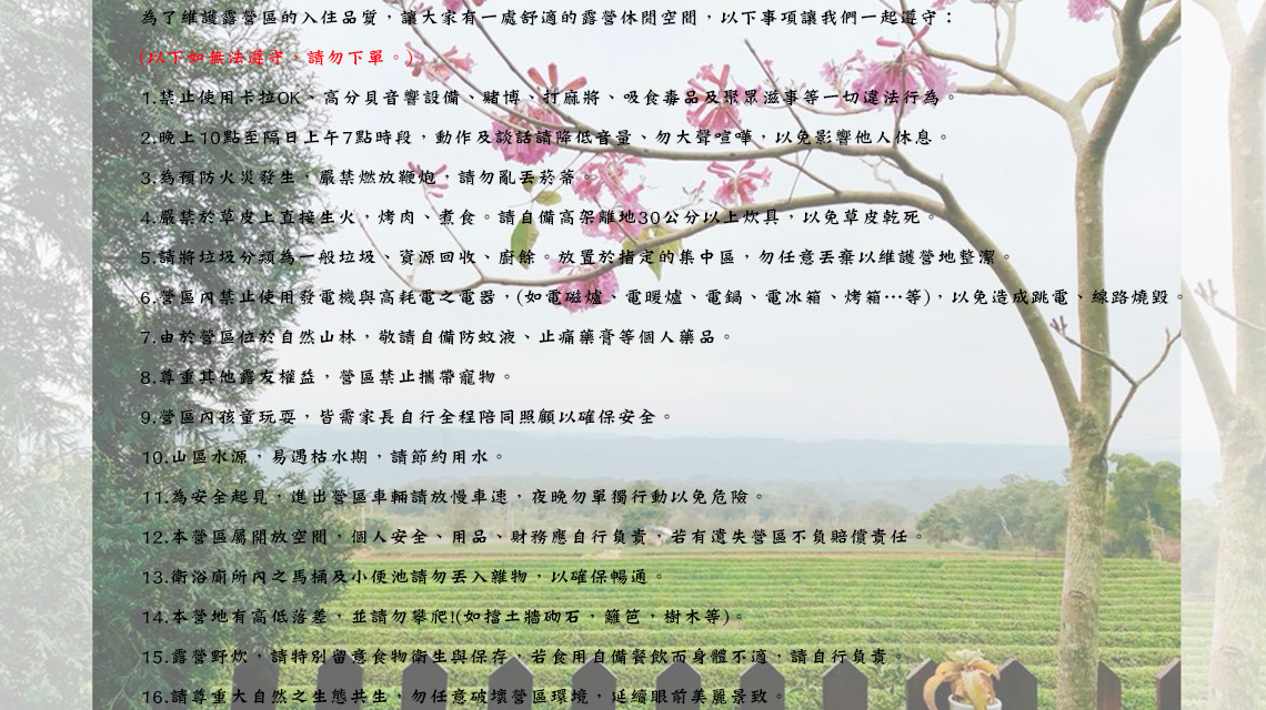 ※ 營區公告:露友若無法遵守以下營區規定者請勿下單,園區有權拒絕您入住,謝謝。