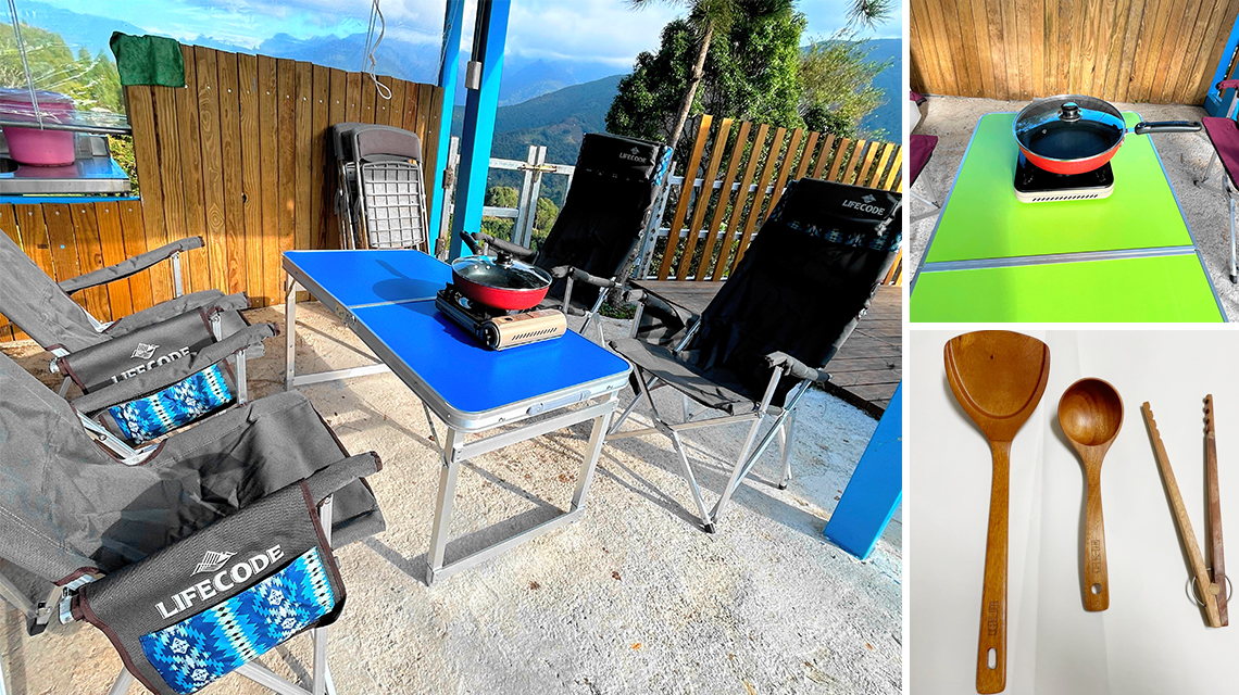 ◎ 雨棚炊事區:含1桌4椅、卡式爐、平底鍋、炊具組(湯勺、鍋鏟、夾子)
