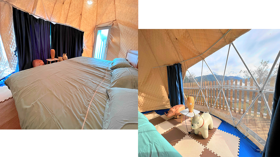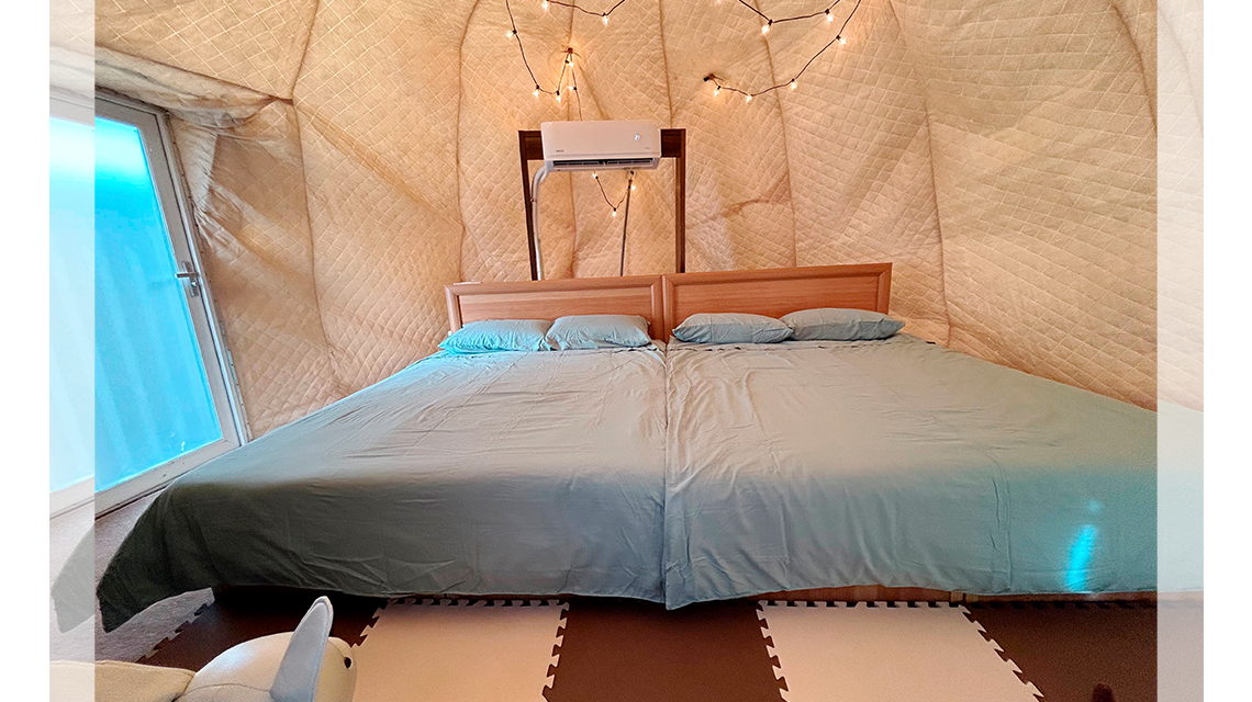 星空帳內:兩張雙人床、寢具(枕頭被子)、冷/暖氣、電風扇、小桌椅(如圖)