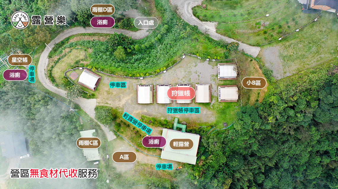 ※ 小B區 水槽1座、電箱1座(請自備延長線 5米以上),車停營位旁。可接車頂帳。