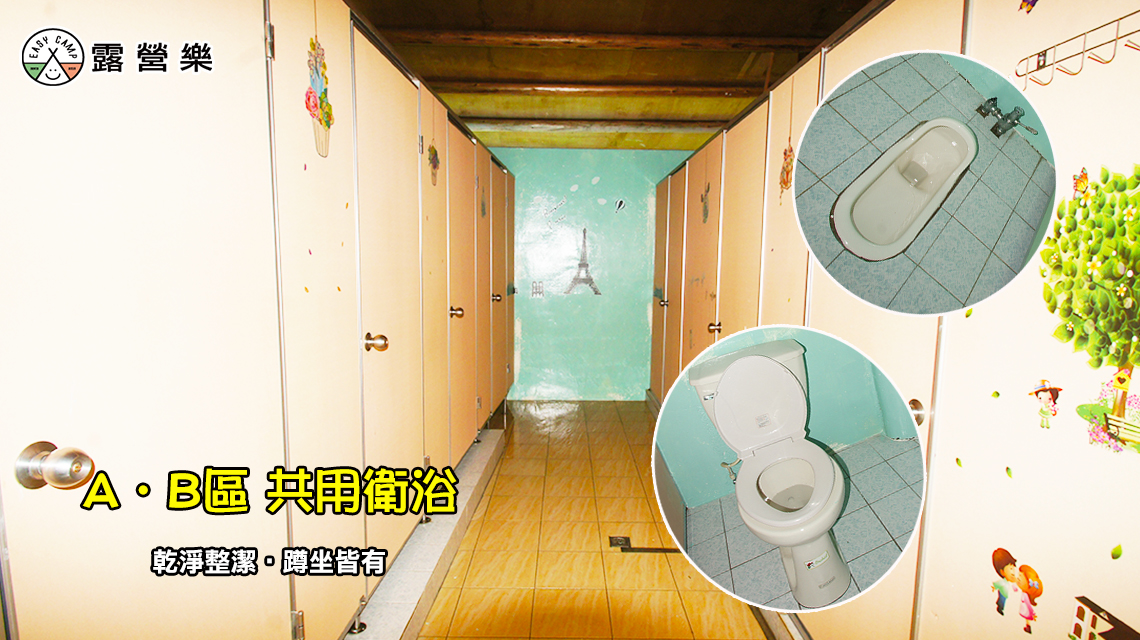 A B區:男蹲式*2、小便斗*3、淋浴間*3,女坐式*1、蹲式*3、淋浴間*3,共用蹲式*2。