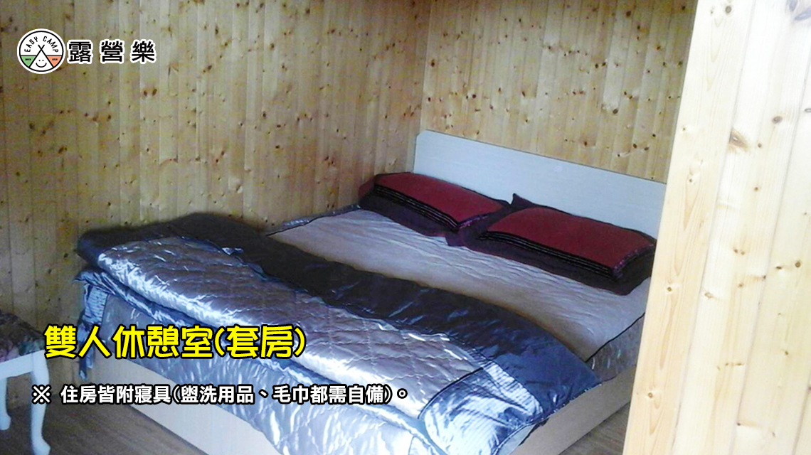 ※ 雙人休憩室(套房):風扇、雙人床x1張 (含寢具)、梳妝桌、獨立衛浴,附早餐。(需至營本部旁『觀景台』炊煮/附桌椅)