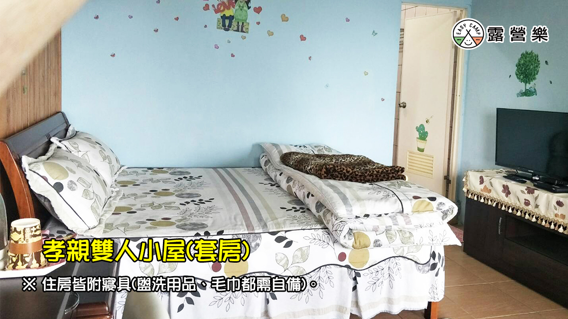 ※ 雙人孝親(套房):風扇、雙人床x1張(含寢具)、梳妝桌、電熱水壺、電視、獨立衛浴,附早餐。(屋外有炊事空間/附桌椅)