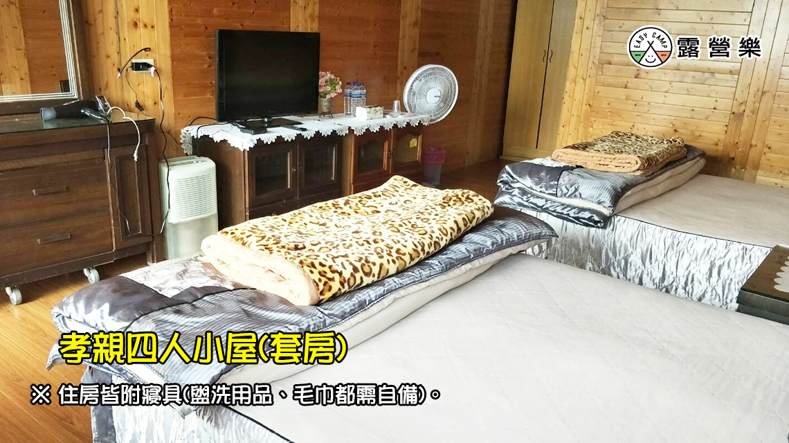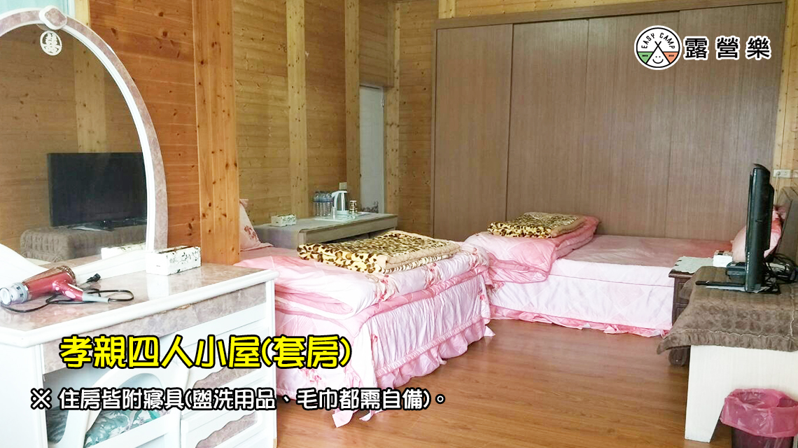 ※ 四人孝親(套房):風扇、雙人床x2張(含寢具)、梳妝桌、電熱水壺、電視、獨立衛浴,附早餐。(需至營本部旁『觀景台』炊煮/附桌椅)