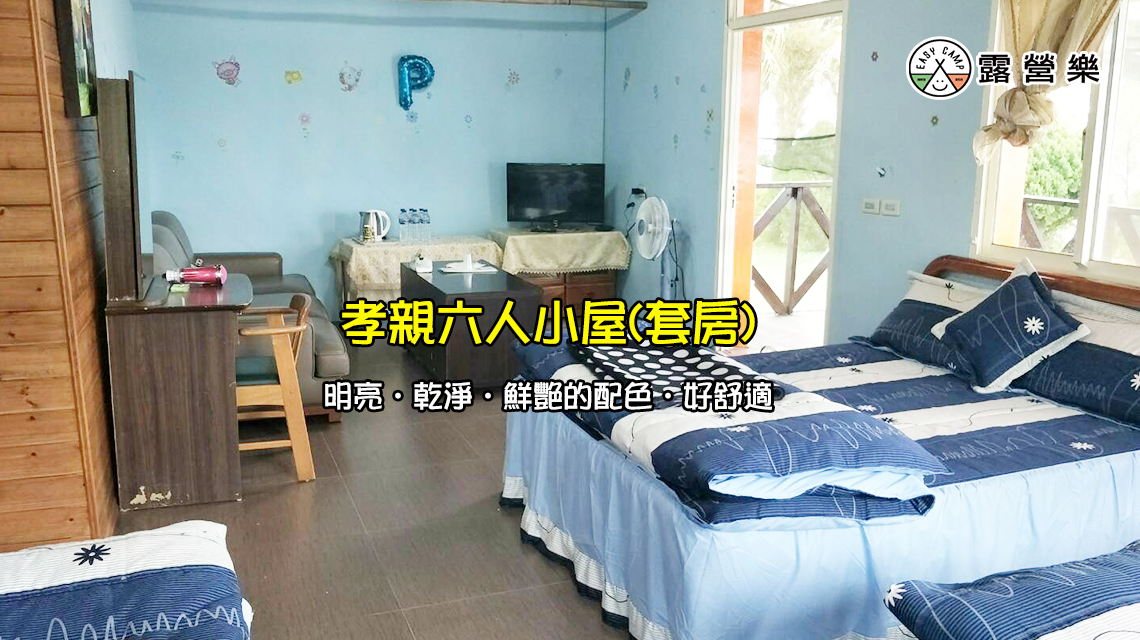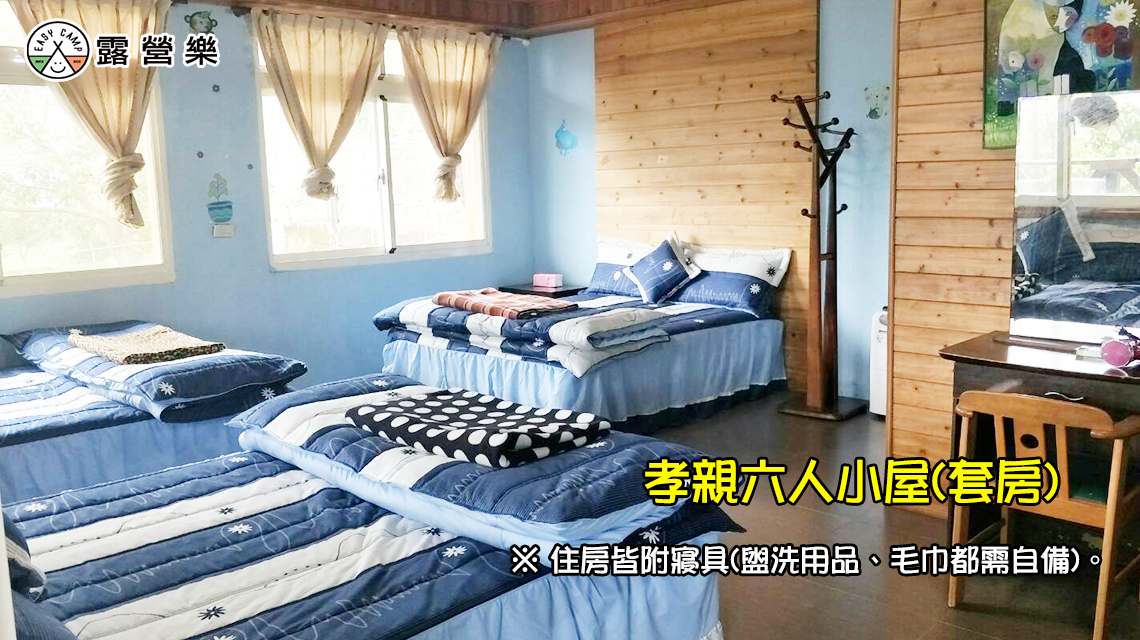 ※ 六人孝親(套房):風扇、雙人床x3張(含寢具)、梳妝桌、電熱水壺、電視、獨立衛浴,附早餐。(屋外有炊事空間/附桌椅)