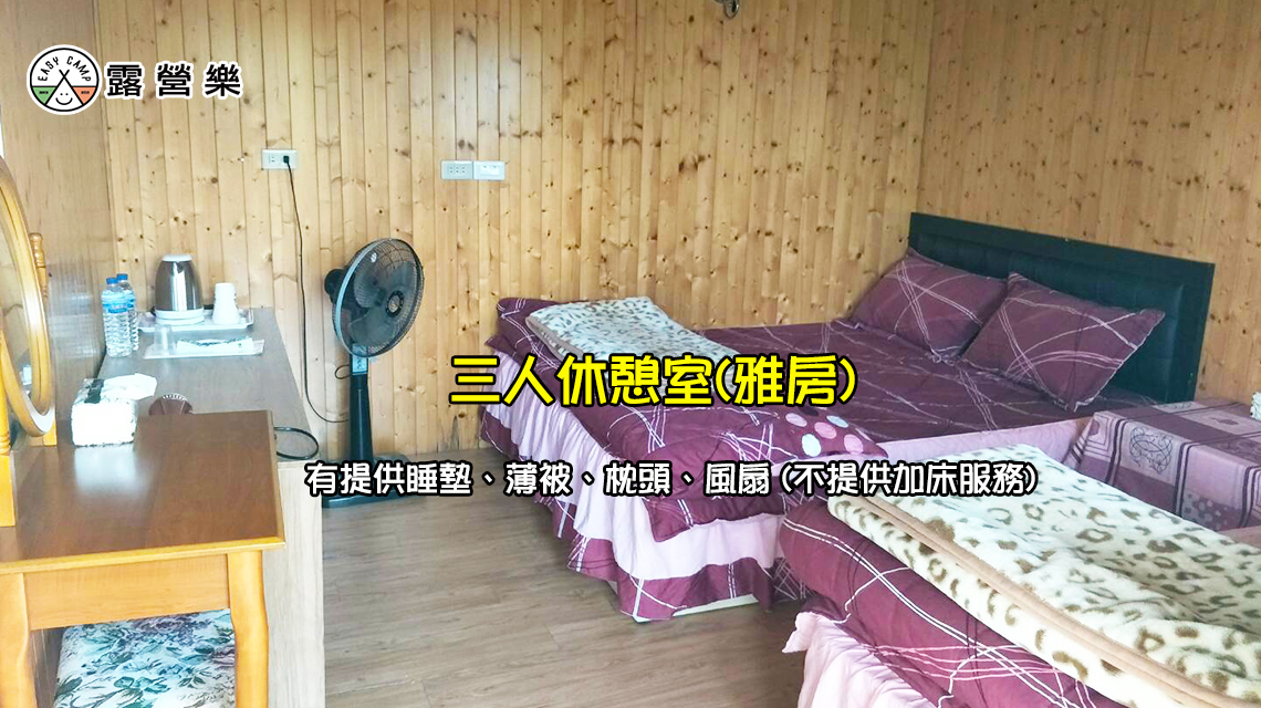 ※ 三人休憩室(雅房):風扇、睡墊、枕頭、薄被、梳妝桌,附早餐。(需至營本部旁『觀景台』炊煮/附桌椅)