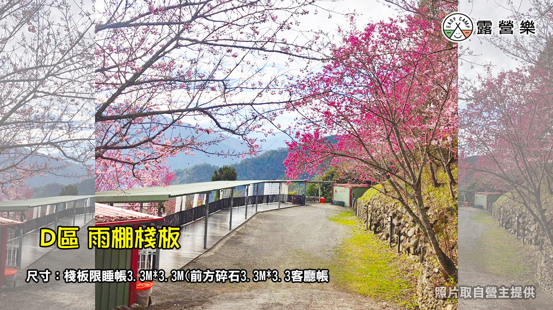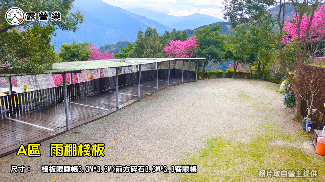 ●自搭帳:木棧板(限搭睡帳)3.3M*3.3M (高2.5M)、前方碎石草地區(限搭客廳帳)3.3M*3.3M
