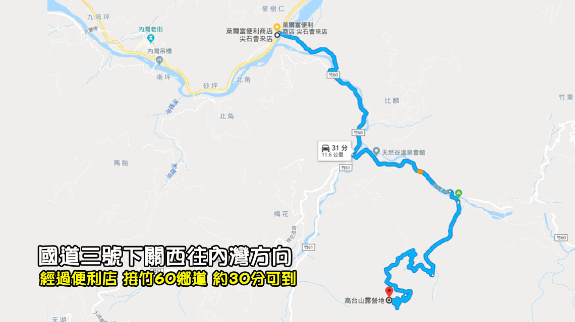※ 過了柿山橋後約有5.5公里山路,產業道路較窄,為了行車安全,建議天黑前到營區,營區附近無住家、無商家,上山前務必備好一切露營用品及食材。(下方企劃圖有交通資訊)
