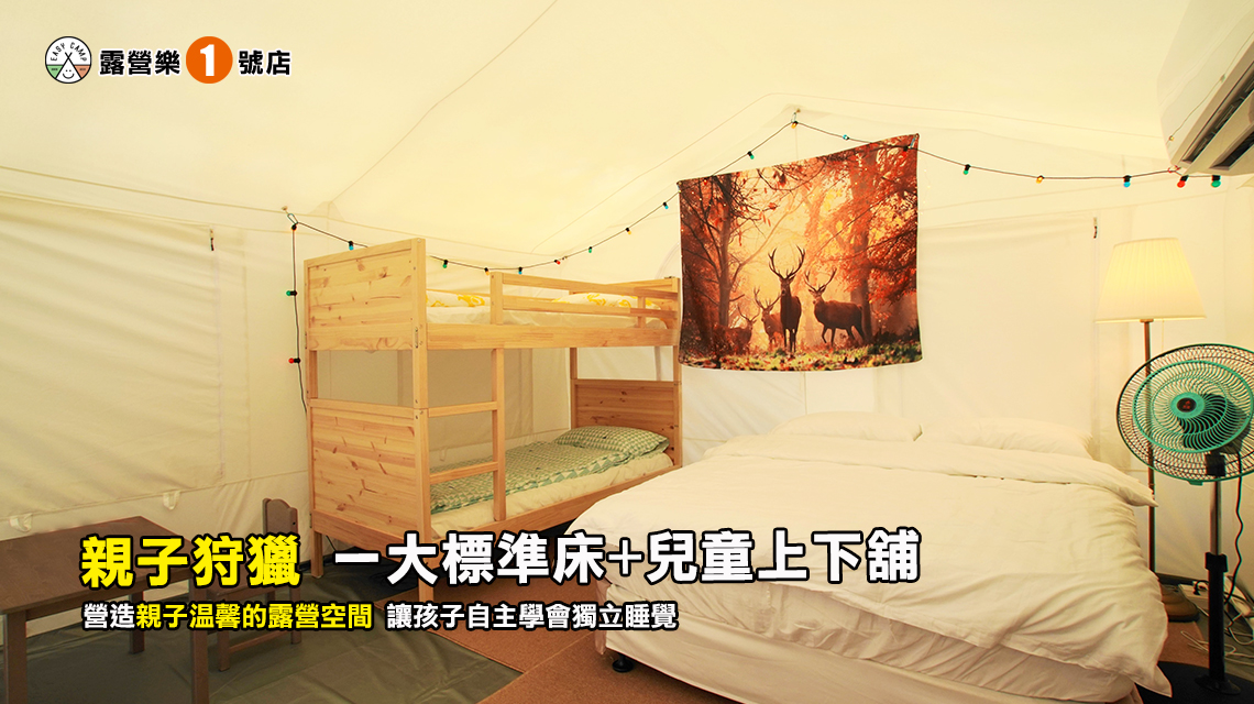 ●親子狩獵帳(限2大2小):兒童床上下舖+雙人床x1、小桌、照明、電扇、冷氣,前庭可炊事。