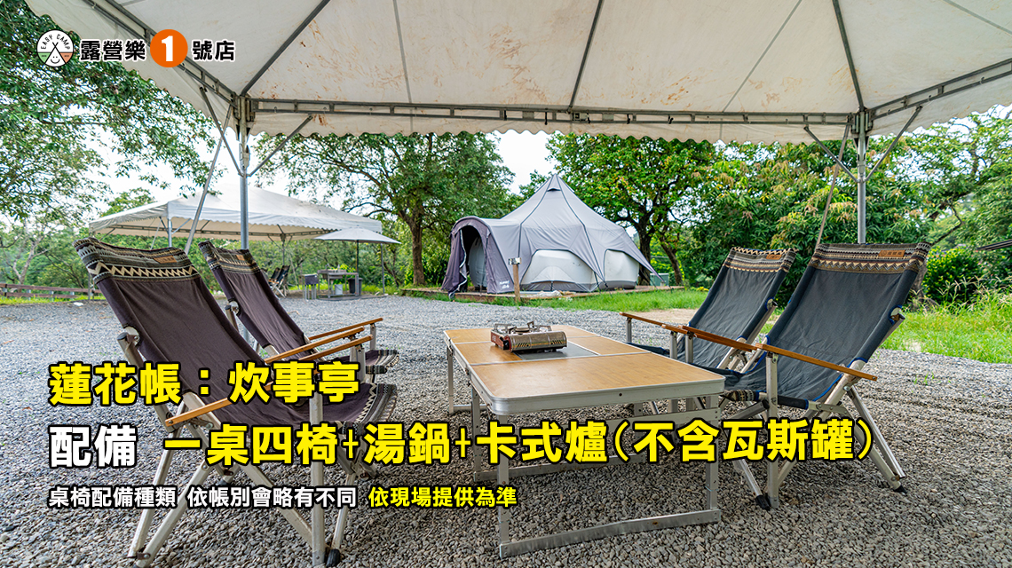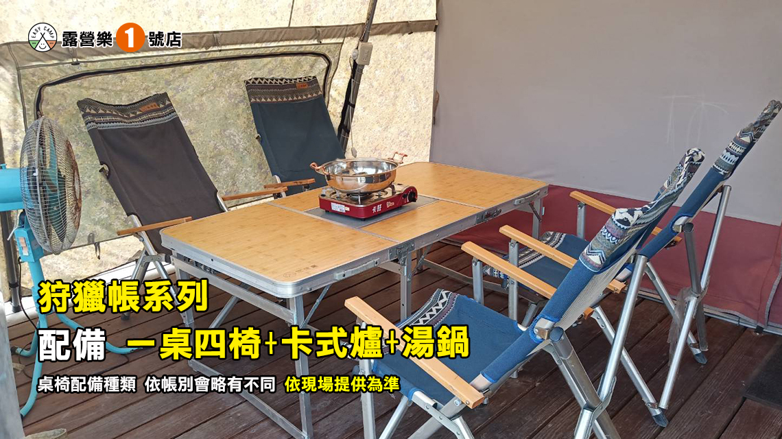 ●每一營帳所附炊事設備:4人桌椅、湯鍋、卡式爐(請自備瓦斯罐或營本部購買)。