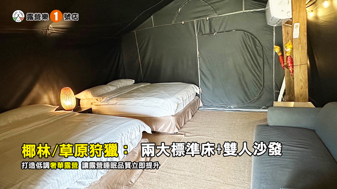 ●椰林/草原狩獵(限4人):雙人床x2、小桌、照明、電扇、冷氣、沙發,前庭可炊事。