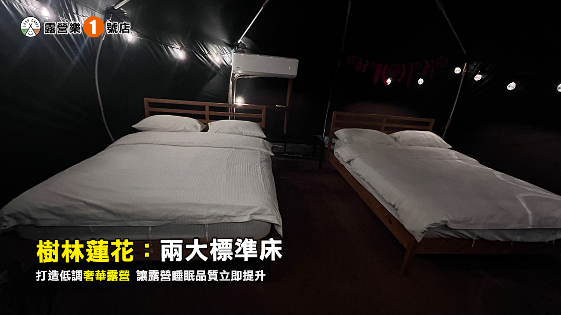 ●樹林蓮花(限4人):雙人床x2、小桌、照明、電扇、冷氣,另附宮廷帳可炊事。