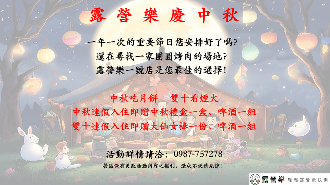 ※ 露營樂1號店慎重公告:本園22:00後請露友降低音量,並關閉任何音響。如經勸導未見改善者將於23:00進行斷電處理,於24:00強制進行不退費離場之要求。請詳閱此規則,可接受再行訂位,謝謝配合。