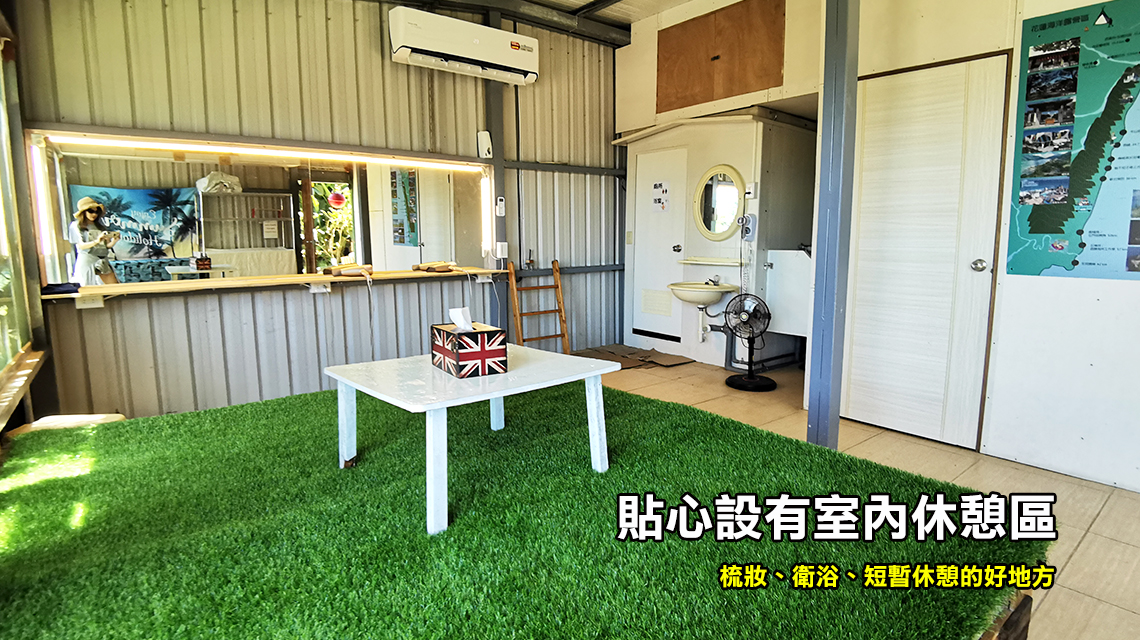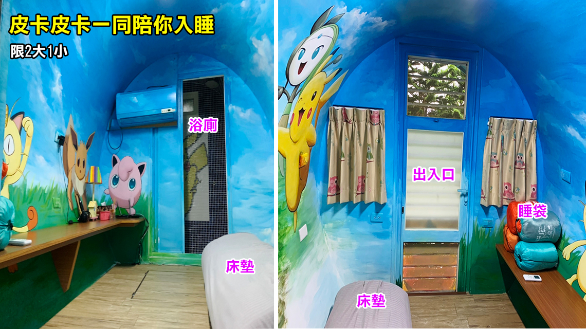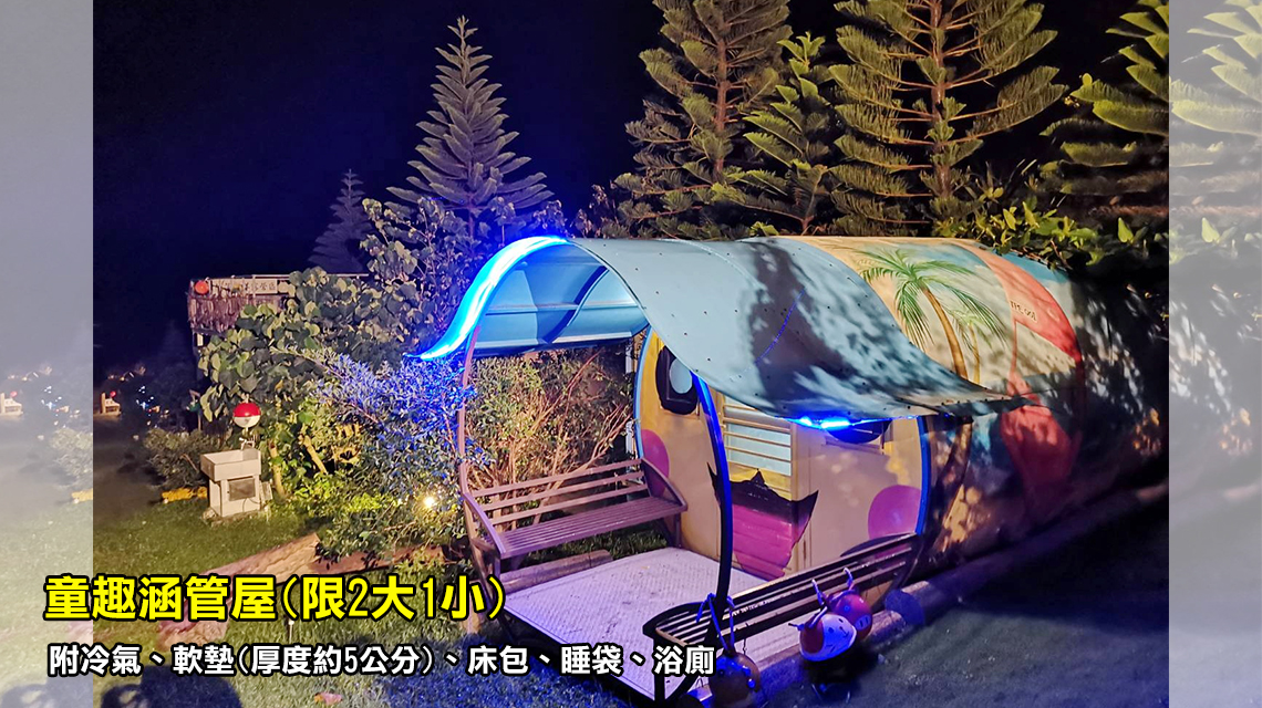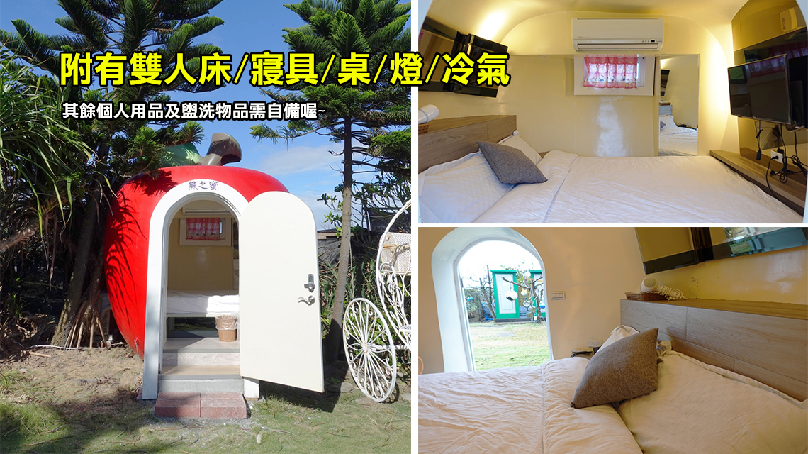※ 附冷氣、軟墊(厚度約5公分)、床包、睡袋、沐浴品、洗髮精
