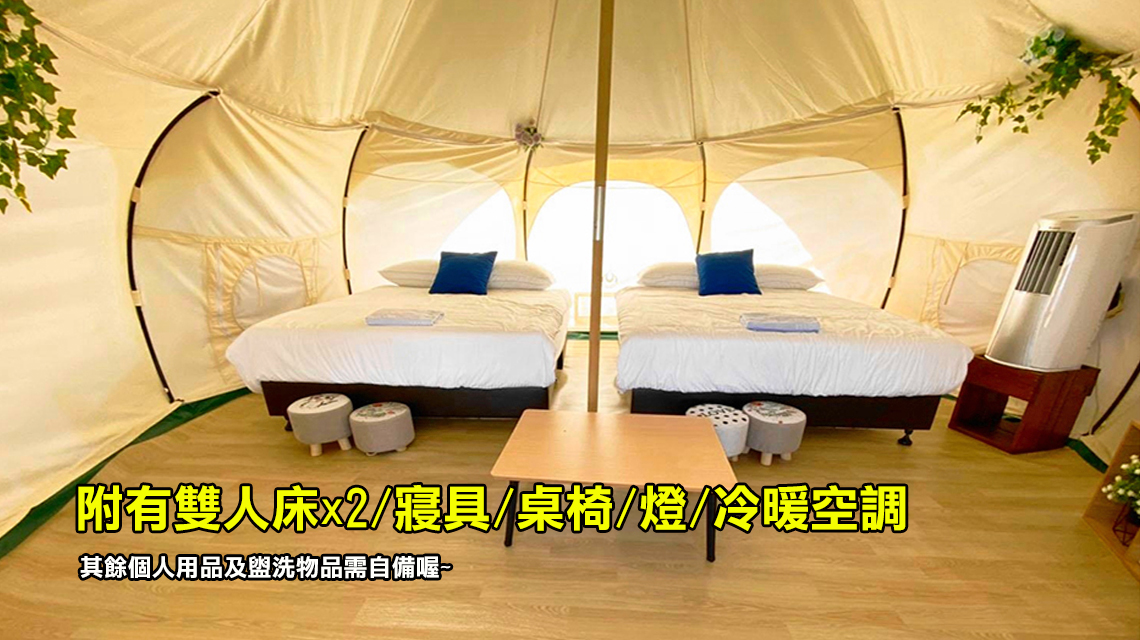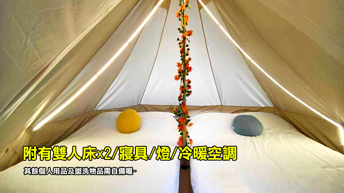 ※ 帳內:附雙人記憶軟墊、寢具、桌、椅、燈、冷氣,盥洗用品需自備