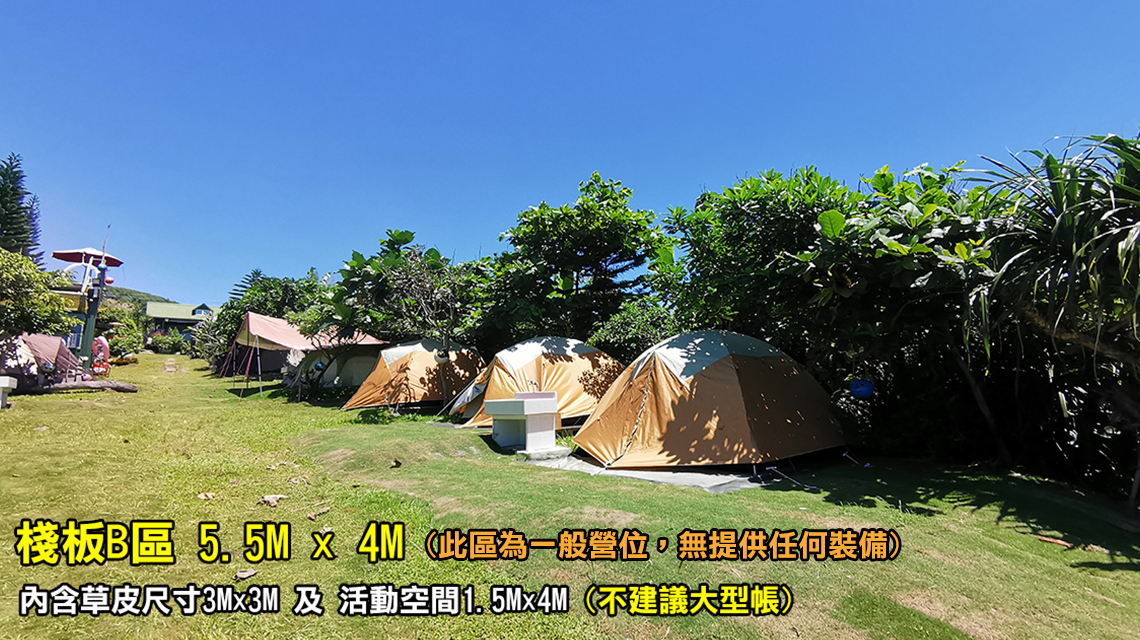 ※ 草皮ABC、棧板B區屬於自搭帳營位,僅提供場地使用,所有露營裝備需自備。