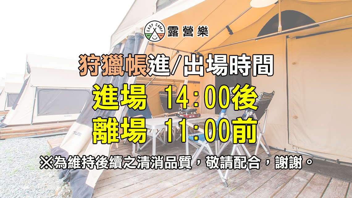 進場 14:00後,離場 隔日11:00前(請務必配合進出場時間)