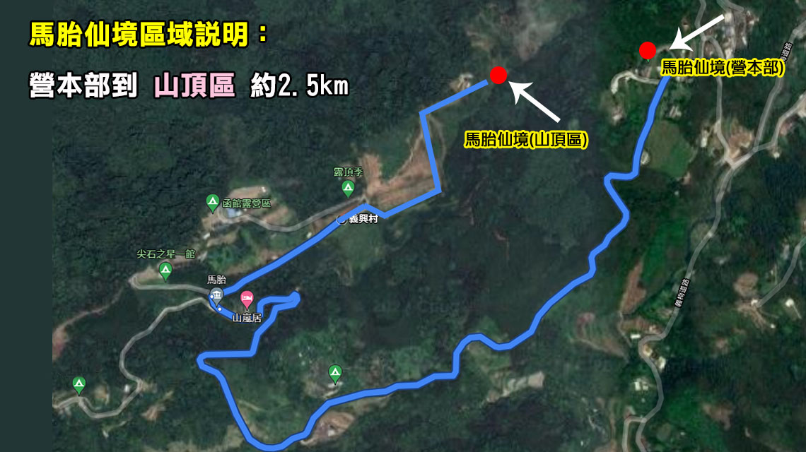 ●營本部入口處:google map請搜尋馬胎仙境,即可到達。