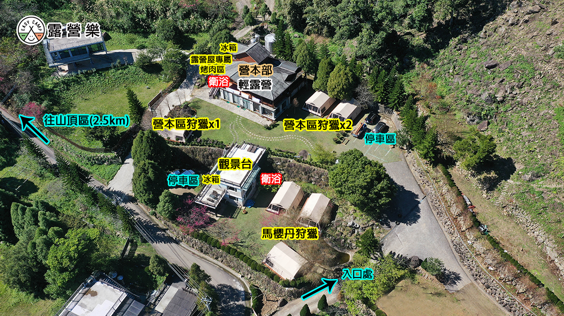 ●營本部與山頂區距離約車程2.5km,如需前往請洽營主確認路線,前往山頂區的路況比較陡,請慢速行駛。