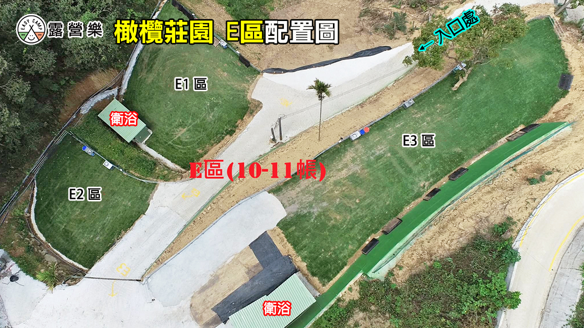 E1區 共用水槽2座、電箱2座(每座插孔5個),請自備延長線10米以上,車停營位旁(可車露) 或下裝備後集中停車。