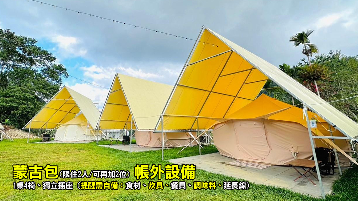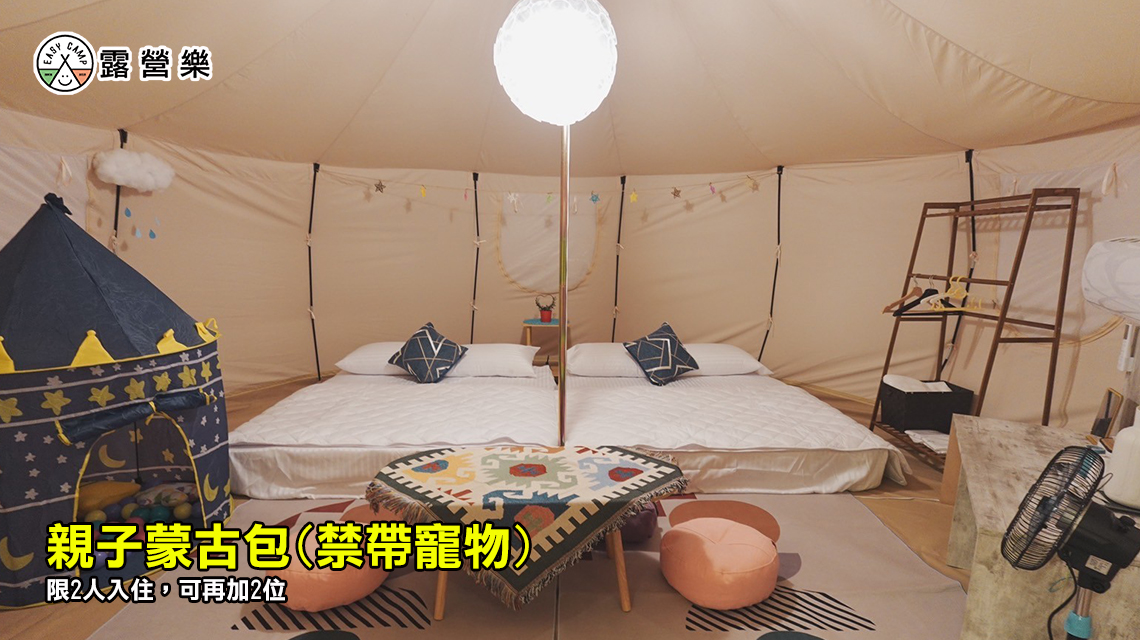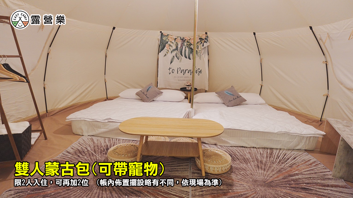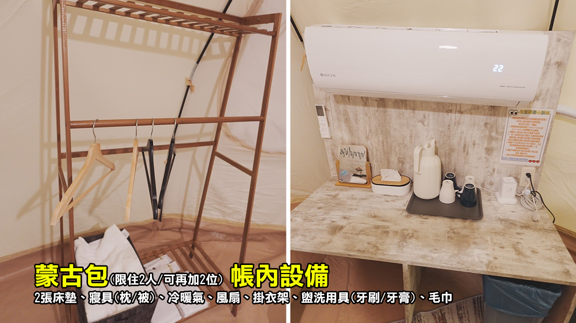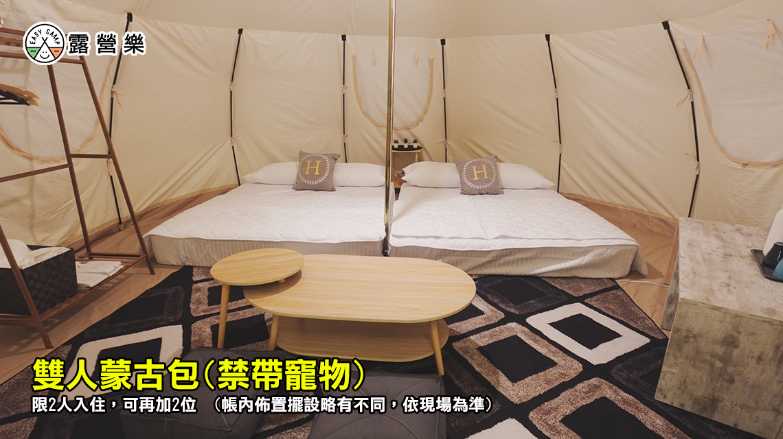 ◎ 帳內含2張床墊、寢具(枕/被)、冷暖氣、風扇、1桌4椅、室外露台。