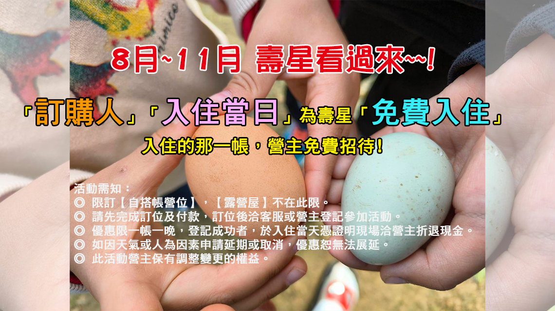 ※「壽星」活動:8月~11月的壽星看過來! 歡迎8/1-11/30來「天湖秘境」過生日, 訂購人當日入住且為壽星,入住的那一帳,營主免費招待~