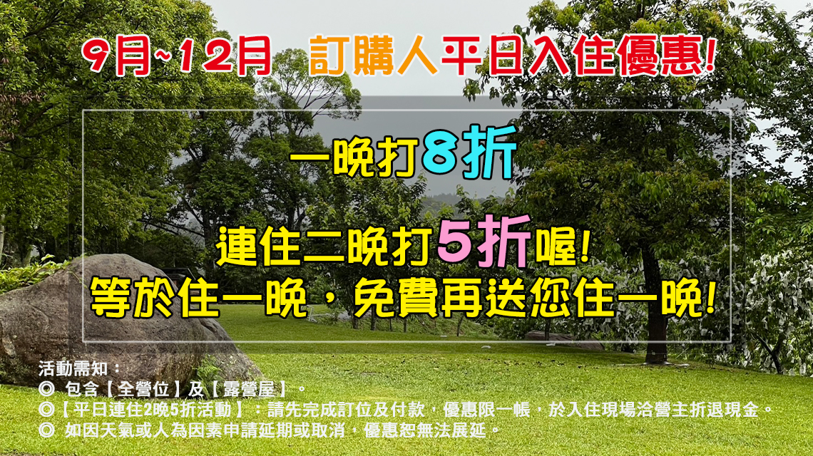☛【平日連住2晚5折活動】:請先完成訂位及付款,優惠限一帳,於入住現場洽營主折退現金。