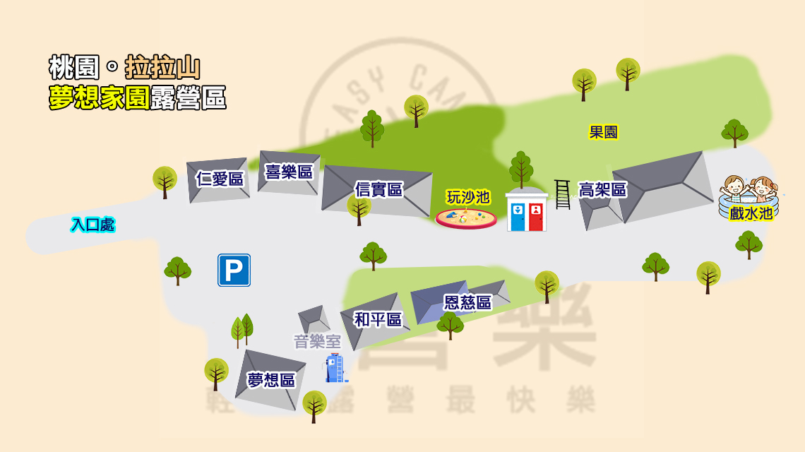 喜樂區-水槽 2 座、電源插孔2個(請自備延長線5米),車停營位旁。