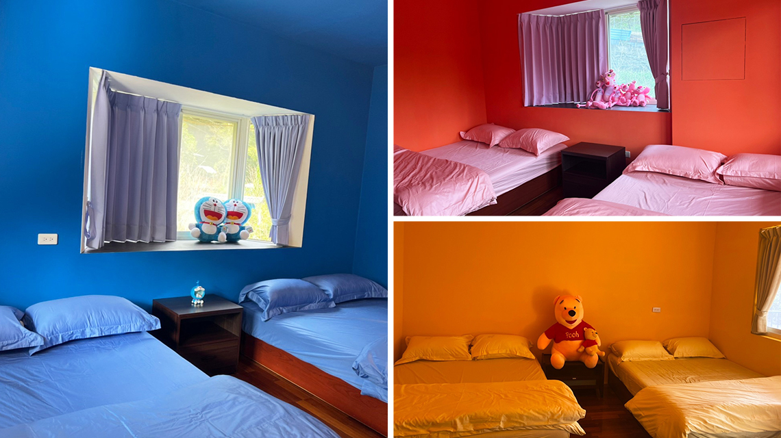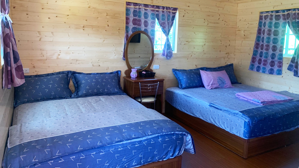 ※ 內設物品:標準雙人床*1+加大床(6x7)*1,迎賓礦泉水、盥洗用品 (牙刷、牙膏、拋棄式洗髮精沐浴乳、一次性毛巾、浴巾)、床墊、棉被、枕頭、電視(可連WiFi)、電風扇、電熱水壺、吹風機及兩門冰箱。