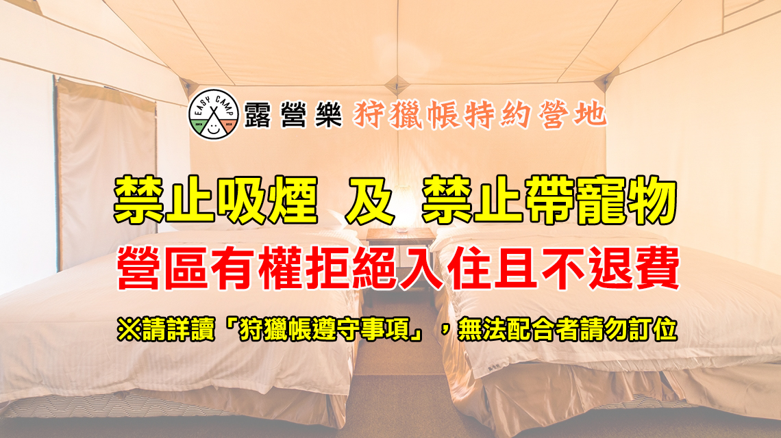 ※ 禁止營火行為:【水岸區狩獵帳】可烤肉,需自備架高烤爐並移出帳篷範圍才可使用,結束後要等灰燼冷卻才能丟棄。其他任何營火行為一律禁止。
