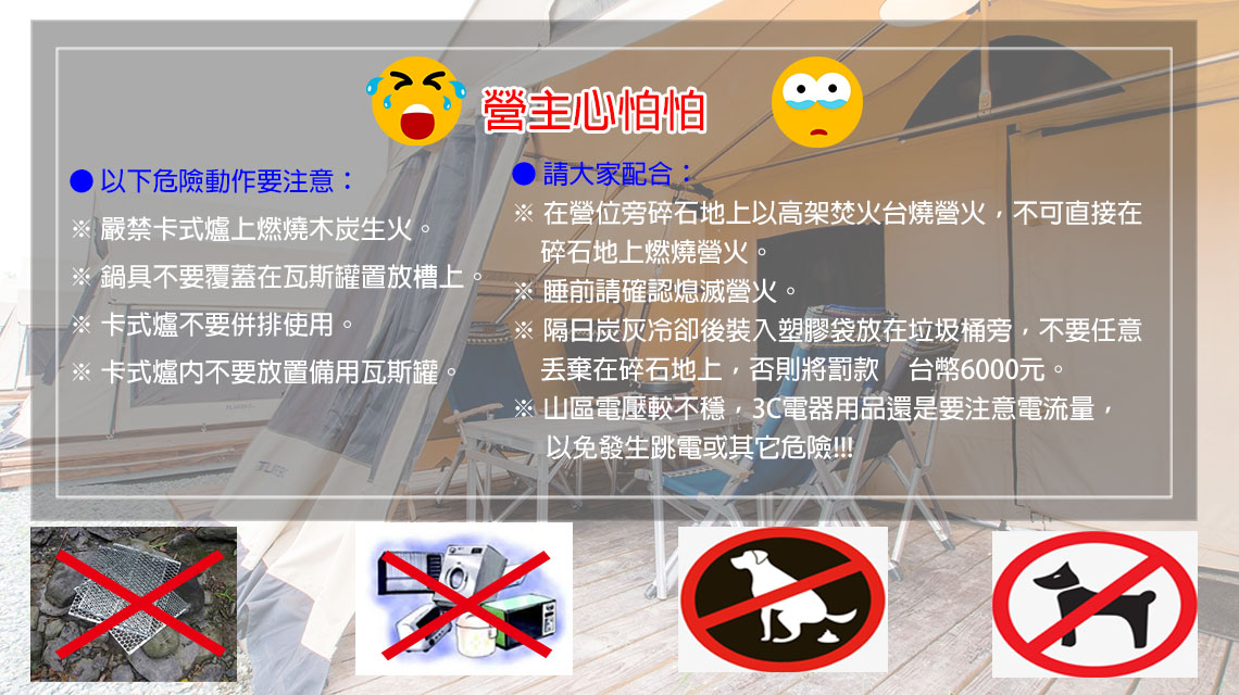 ※ 營主辛苦清潔維護之環境請露友也愛惜使用,離場時經人員檢查若有損毀,需以維修報價或市售價給予賠償。入住期間有任何問題請直接向營主提出反應,並祝露友們假期愉快。