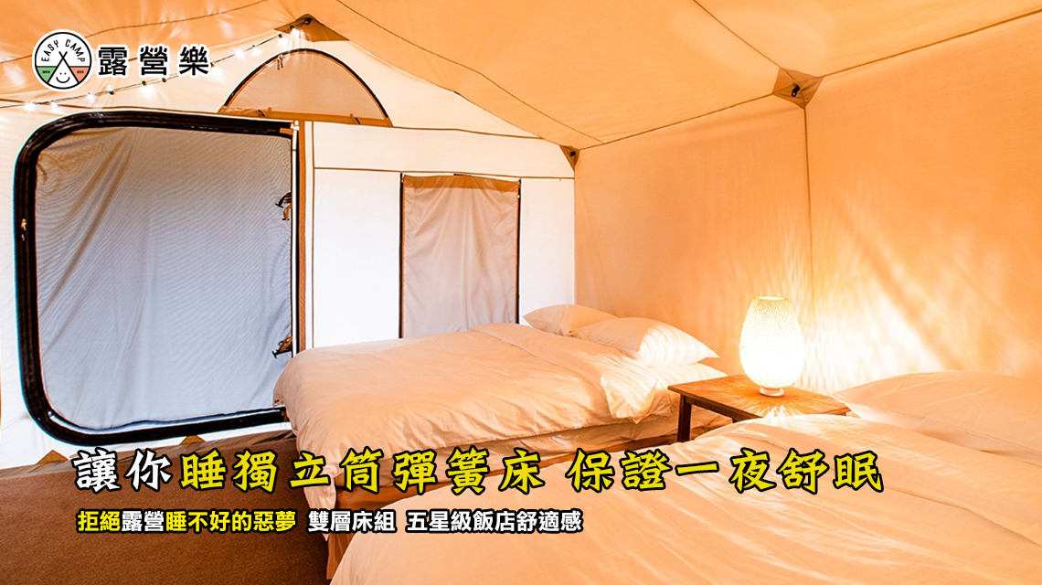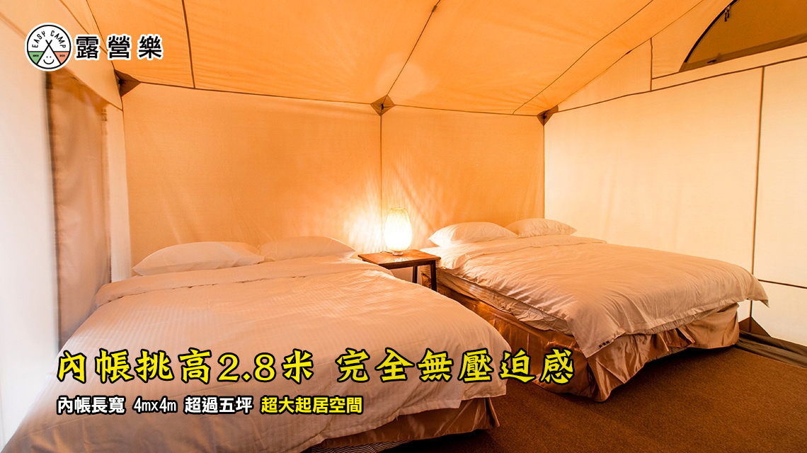 ● 帳內設備:雙人床2套(含枕、被、床包)、小桌、內外照明燈、風扇、冷暖空調。